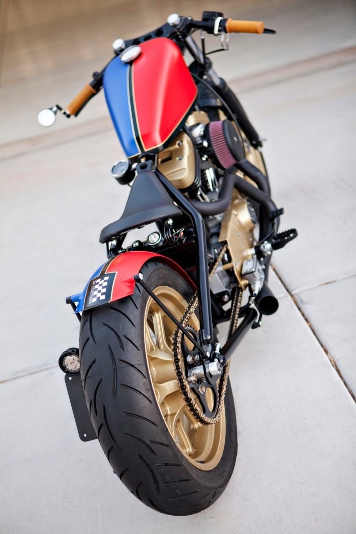 Introducing “Hollywood.” If any of our bikes were ever meant to be seen cruising on Mulholland Drive, this is it. Beautiful, elegant and tough as nails. Based on a hopped up 1200cc with our handmade 2 into 1 exhaust. Brembo brakes and Metzeler Z8’s slow it down. The only thing more fun than looking at this machine is riding it.